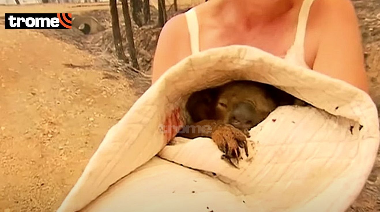 El koala había sido rescatado mientras huía de las llamas en una carretera. En las imágenes se ve como una mujer se quita la blusa para enrollar con esta al animal y luego rociar agua para aliviar su dolor.