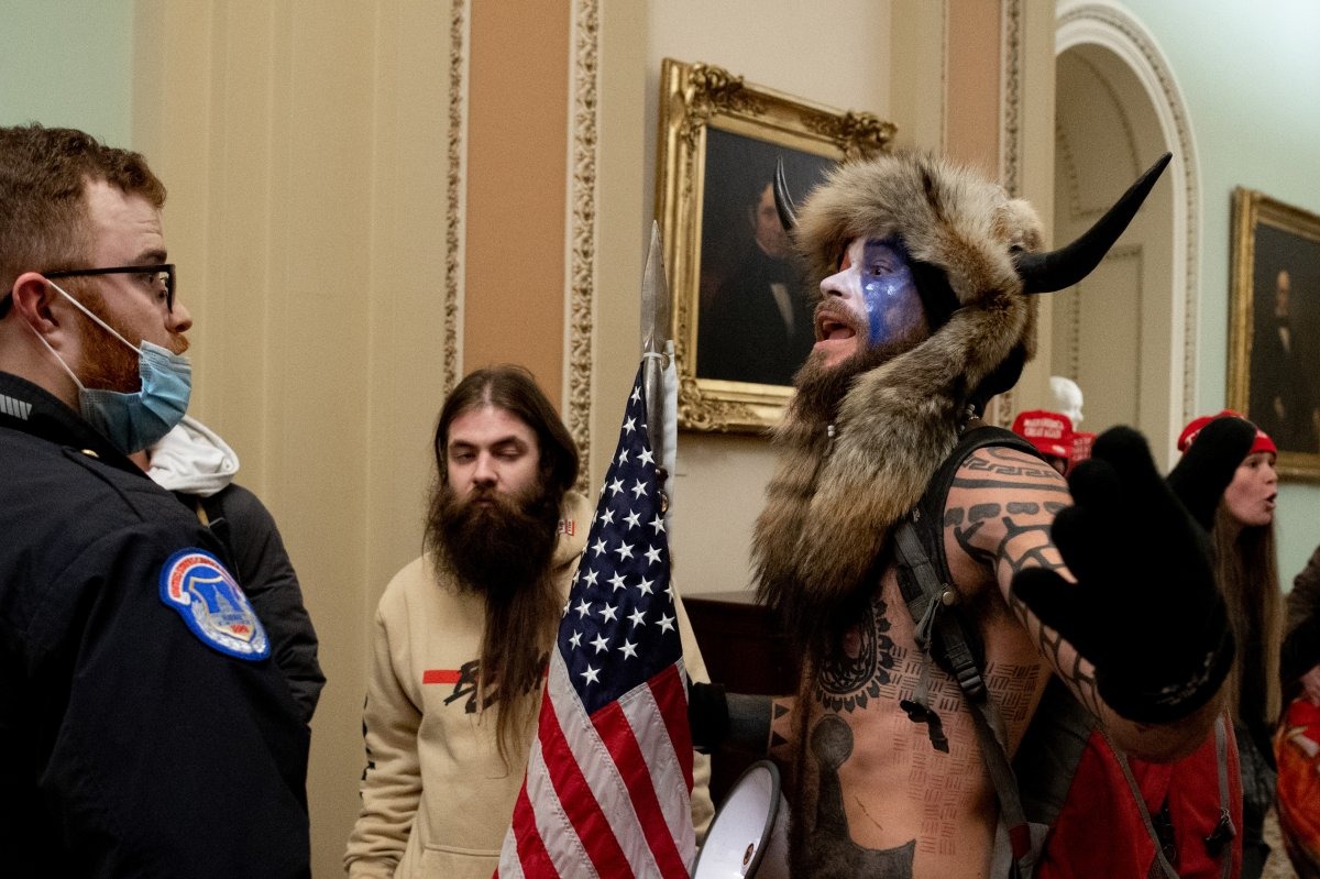 Con el torso desnudo, tatuajes, el rostro pintado con los colores de la bandera de Estados Unidos, un sombrero de piel y dos cuernos sobresaliendo, este inusual personaje estuvo transitando en la cámara de senadores y fue fotografiado incluso en el estrado destinado al presidente del cuerpo legislativo.