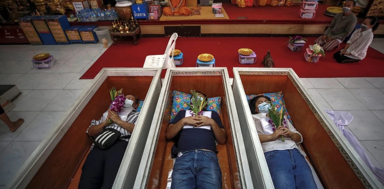 Los vivos también pueden estar presentes su propio velorio. En la ciudad de Bangkok, en Tailandia, hay un templo budista que todos los días celebra funerales para personas vivas. Una especie de muerte y nacimiento a la vez. Durante la ceremonia, los fieles permanecen acostados dentro de un ataúd cubierto por una sábana mientras el budista recita una serie de plegarias. Los creyentes son velados para purgar su mala suerte y atraer la fortuna.