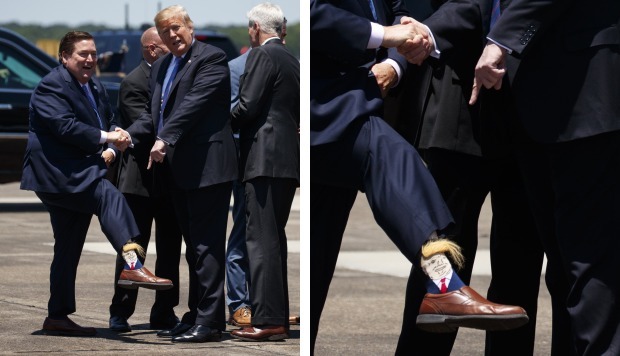 El presidente de Estados Unidos, Donald Trump, recibió un peculiar homenaje por parte del vicegobernador de Louisiana a su llegada a este estado el martes. Billy Nungesser, aparente admirador del mandatario, decidió liderar una comitiva de bienvenida para mostrar sus calcetines: unos con una caricatura de Trump con peluca incluida.