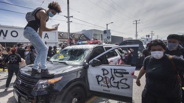En Los Ángeles, agentes dispararon bolas de goma y cargaron con porras durante un enfrentamiento con manifestantes que le prendieron fuego a un vehículo policial.
