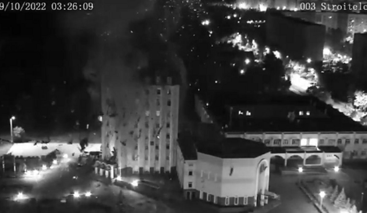La cámara de seguridad en el lugar captó el momento preciso del impacto. El video dura menos de 30 segundos y muestra la explosión posterior al impacto del misil, la formación de un destello blanco y cómo la infraestructura del ayuntamiento tiembla, según La Nación.