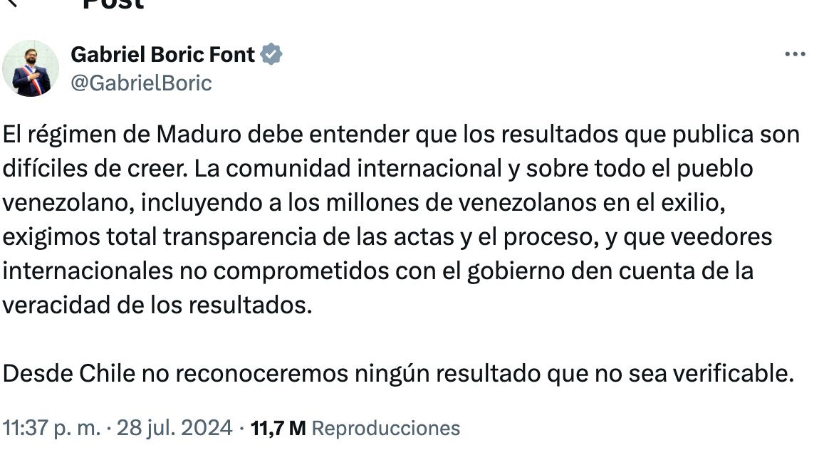 El mandatario chileno Gabriel Boric expresó públicamente su rechazo al triunfo de Maduro y remarcó que su gobierno esperará la verificación de las actas.