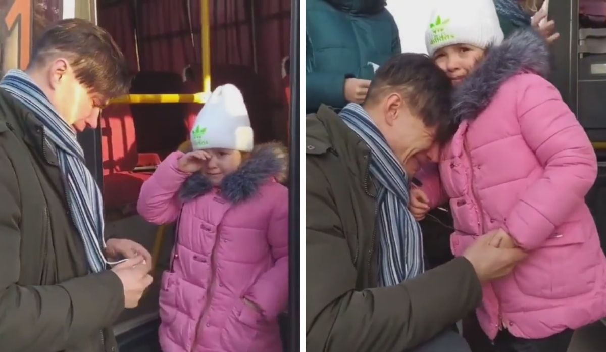 El hombre se despide de su esposa e hija en una estación de buses en Ucrania y el momento se viralizó en redes sociales.