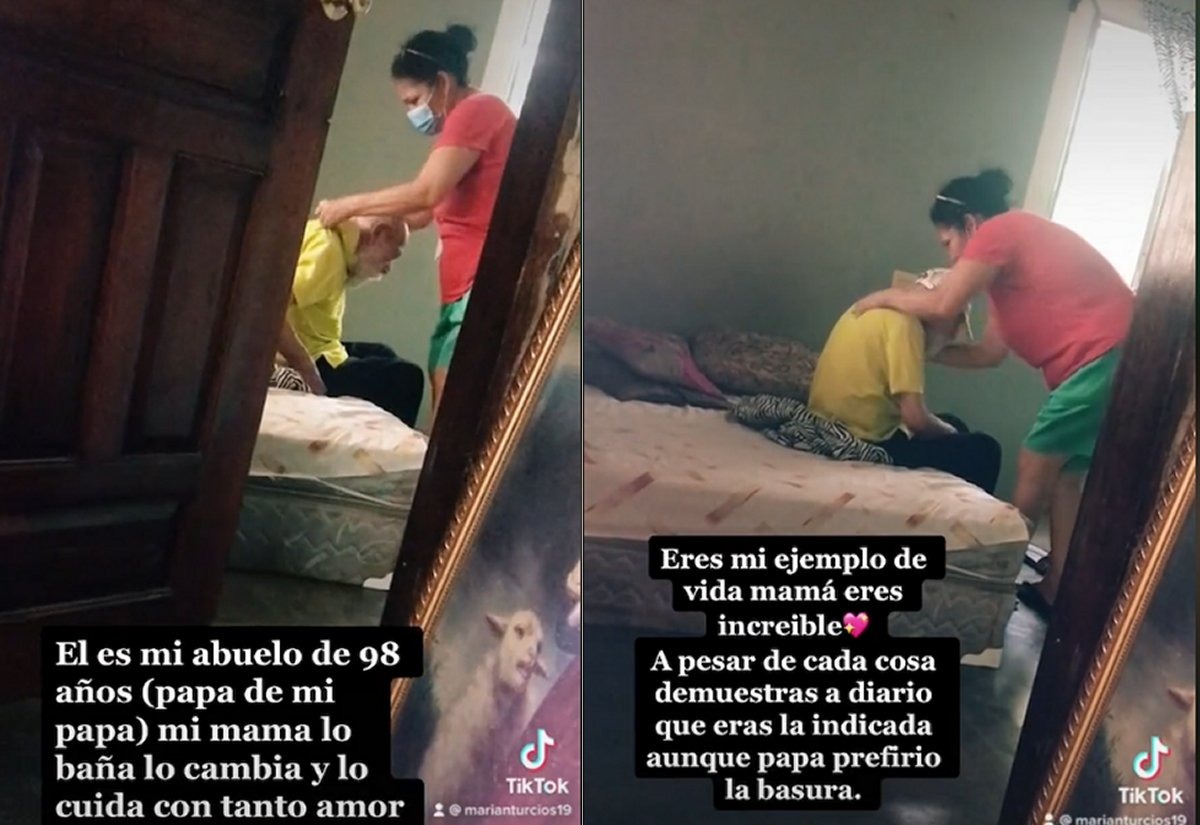 “Él es mi abuelo de 98 años (papá de mi papá), mi mamá lo baña, lo cambia y lo cuida con tanto amor”, continúa explicando la usuario de TikTok Marian Turcios Corea, quien hasta el momento ha obtenido más 300 mil “Me gusta”.