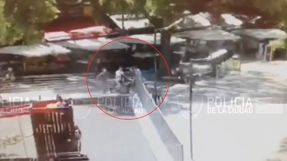 Tan solo minutos después, a las 12:29, en otro video registrado por la cámara de seguridad del bar Diggs, ubicado en la calle Serrano al 1.500, se observa a la víctima siendo abrazada por el sujeto que se la llevó desde la plaza, horas antes del ataque. El hombre vestía de gris y gorra verde.