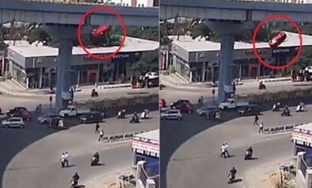 India. Un auto que iba a toda velocidad por la carretera en un puente en Hyderabad, salió volando en una curva, cayendo sobre varias personas. En las imágenes que se difundieron en YouTube se aprecia cómo el coche tardó varios segundos en caer, demostrando la gran altura de la estructura.