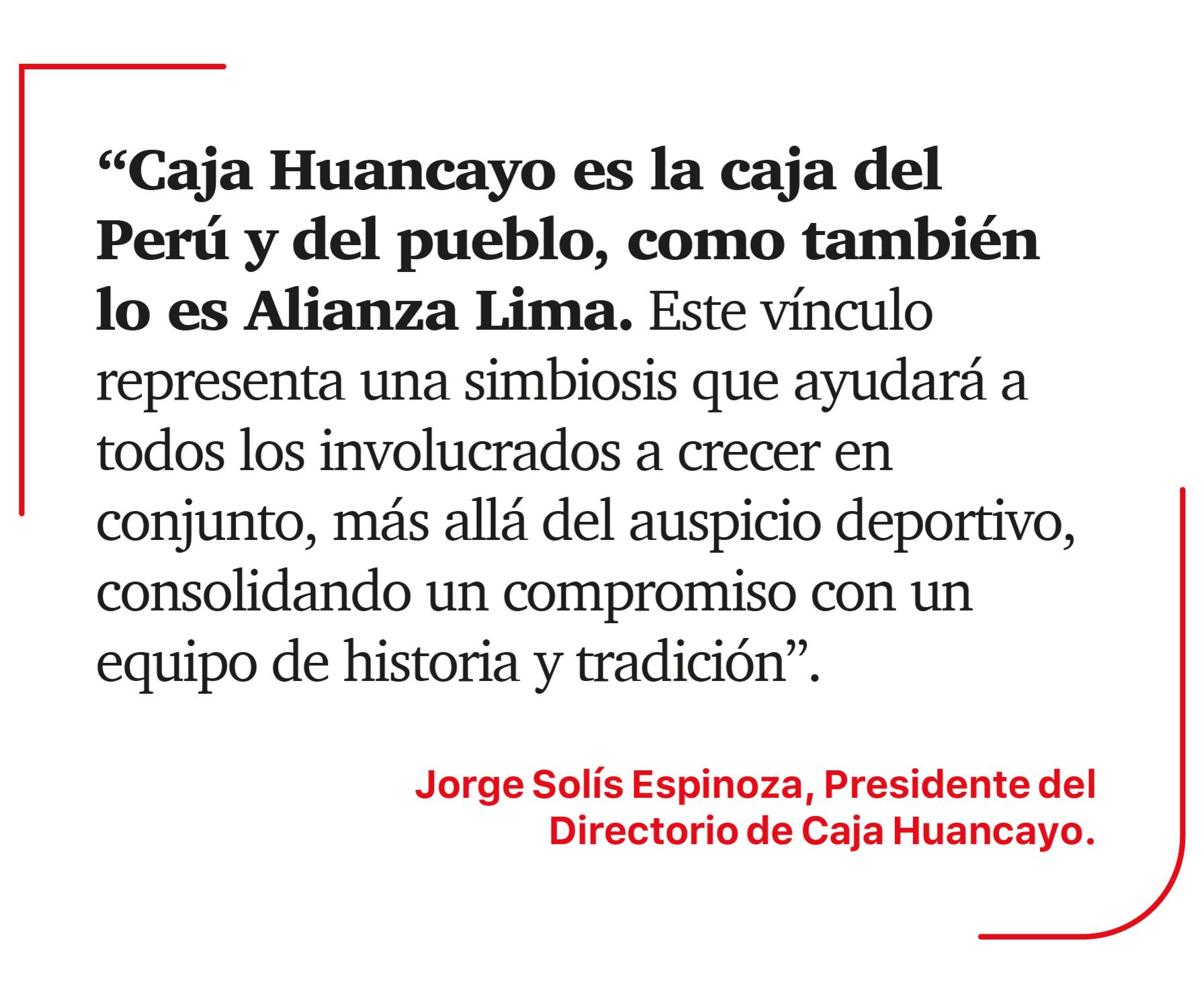Jorge Solís Espinoza, presidente del Directorio de Caja Huancayo, destacó la importancia de esta unión: “Se trata de un paso trascendental de Caja Huancayo. Este vínculo va más allá del auspicio deportivo; es un compromiso con un equipo de historia y tradición. Alianza Lima está próximo a cumplir 124 años, y es un privilegio consolidar esta relación con una visión más amplia”. También destacó que la financiera es la primera entidad del país en formar parte de una alianza promovida por el Banco Mundial y el Banco Interamericano de Desarrollo (BID), reafirmando así su liderazgo.