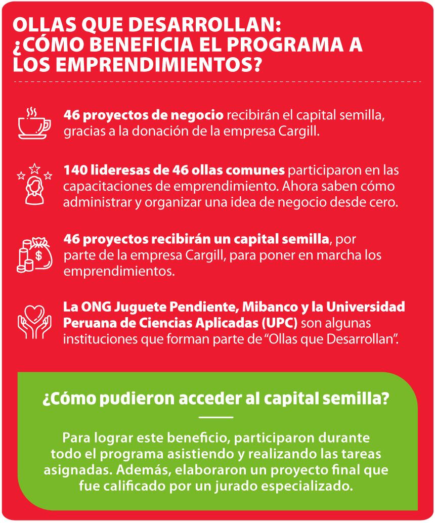 Las madres de “Unidos por el hambre” esperan con ganas el capital semilla que les brindará Ollas que Desarrollan junto a la empresa Cargill, un apoyo que llegará a 46 ollas comunes. Así, obtendrán un horno multiusos que les permitirá preparar más queques a diario y llegar a otras zonas y colegios de Santa Rosa. “Vamos a implementar y mejorar nuestro emprendimiento. Para acceder al capital semilla, toda la junta directiva ha participado en la creación del proyecto. Estamos entusiasmadas”, destaca Juana.