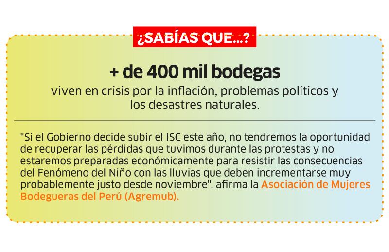 La Asociación de Mujeres Bodegueras del Perú (Agremub) solicita al Gobierno que descarte la posibilidad de aumentar este año el Impuesto Selectivo al Consumo (ISC). El ministro de Economía mencionó que la decisión podría postergarse hasta noviembre, pero dicho anuncio no les brinda la tranquilidad necesaria a las bodegueras para prepararse con anticipación para la campaña de Navidad.