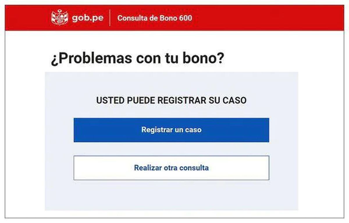 - Tras ello se cargará la página “¿Problemas con tu bono?”, donde te mostrará dos opciones: registrar un caso y realizar otra consulta. Haz clic en “Registrar un caso”.