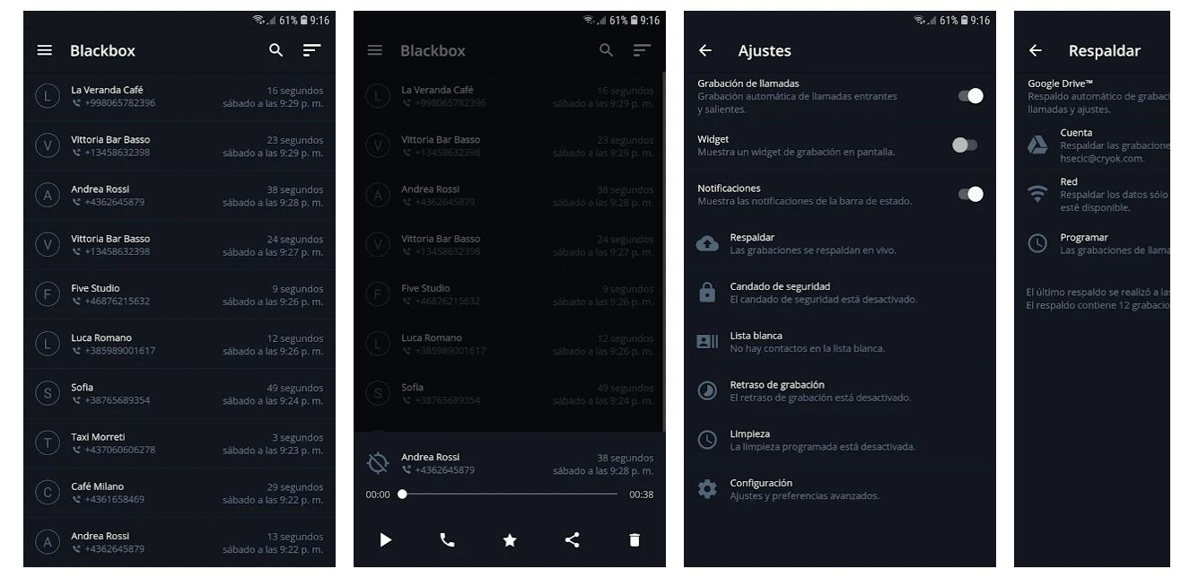 Blackbox se define a sí misma como una aplicación de grabación profesional. Esta app te da la posibilidad de elegir la calidad de los audios y hacer copias de seguridad en la nube. Además, cuenta con un bloqueo de seguridad, soporte para auriculares bluetooth, soporte para doble SIM y listas blancas de contactos. También tiene un acceso a una versión premium, que se realiza mediante suscripción.