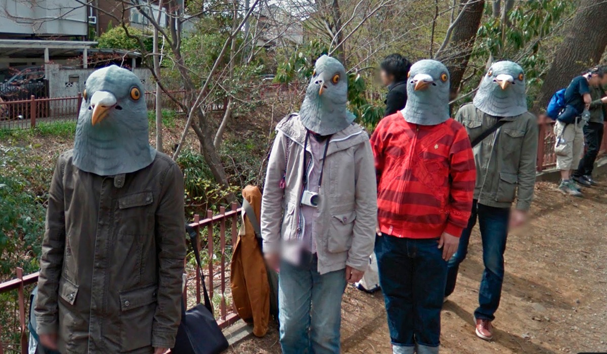 Ellos sabían que ese día pasaría por allí el auto de Google y quisieron posar de lo más memorable y pasar a la historia de la red. Pero lo más escalofriante es comprobar lo fácil que es conseguir en Japón máscaras con cabeza de paloma.