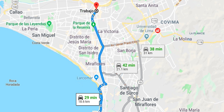¿Y las azules? Simplemente indican que hay un tránsito bastante fluído y es la ruta más adecuada que debes tomar. Verás mucho más de ellas durante la madrugada e incluso en horas que no son pico.
