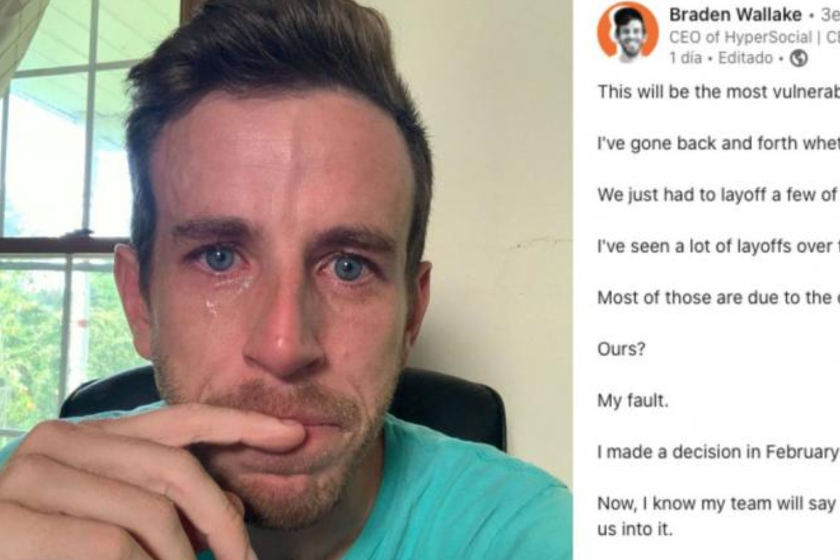 Braden Wallake es el CEO de ‘HyperSocial’, una compañía que ofrece servicios de marketing a diferentes empresas. En días recientes publicó en su cuenta de Linkedin la extrema medida mediante un extenso mensaje. Lo curioso es que, junto a su texto, colgó una fotografía suya aparentemente llorando.