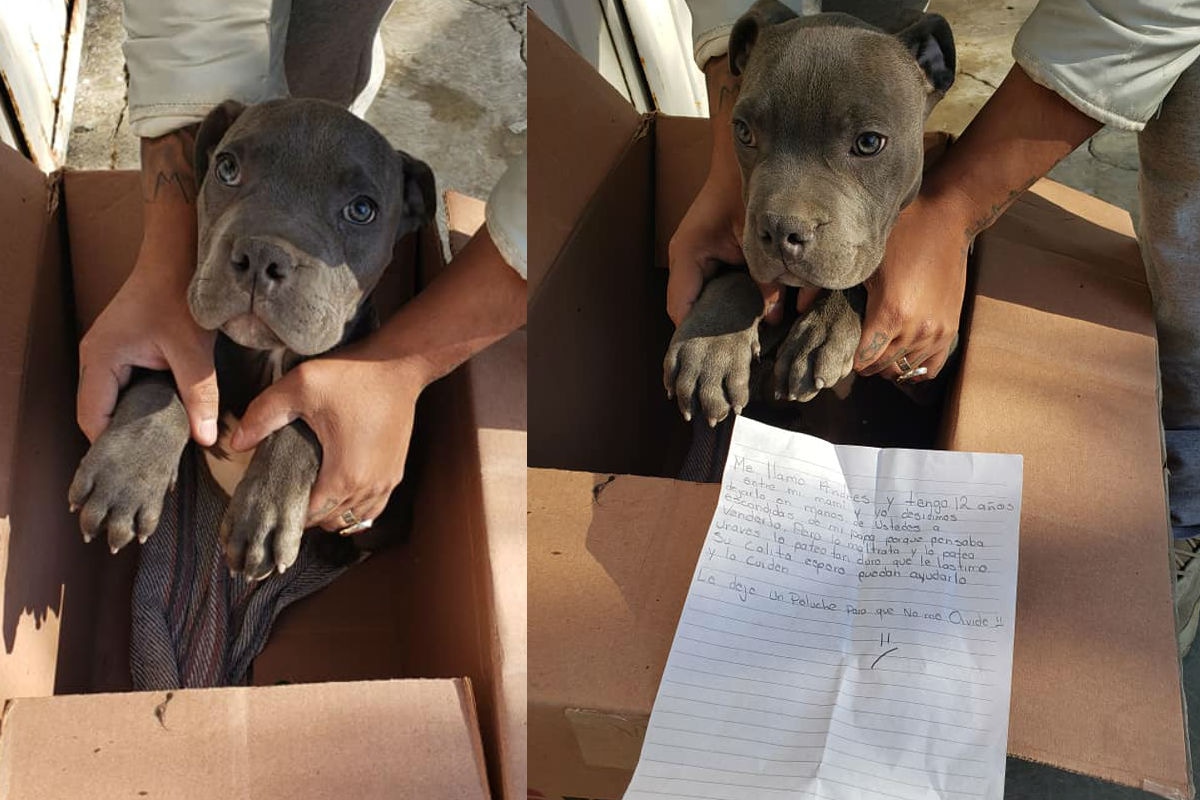 El niño de nombre Andrés dejó a su perro afuera de la sede del refugio Xollin, para que sea ‘salvado’ de los maltratos de su padre, según explica en la nota que acompañaba al perrito de raza pitbull.