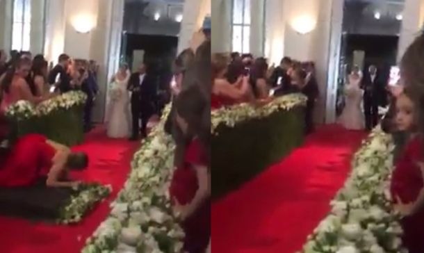 Pese a que los organizadores trataron de salvar la situación, en el video de Facebook se ve que la novia tuvo que tragarse este 'hipo' en su boda de ensueño por varios segundos, ante de poder continuar. ¿Qué le habrá dicho después a invitada que cayó?