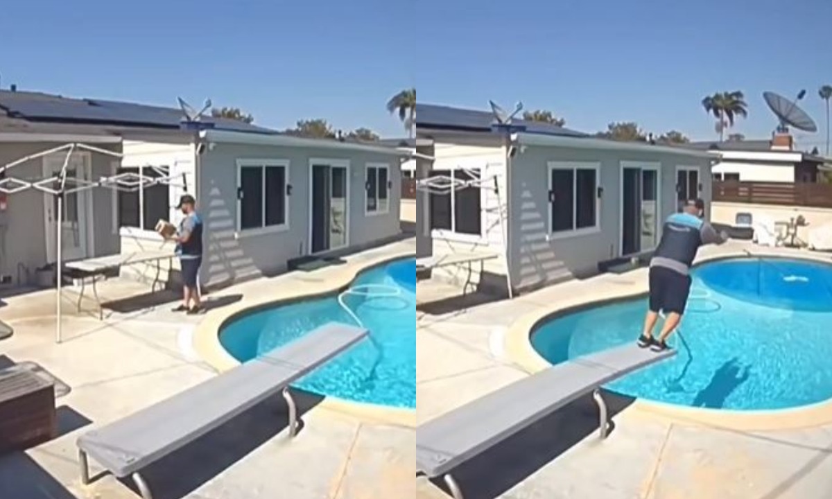 El divertido momento tuvo lugar en Gardena, un suburbio de Los Ángeles, el sujeto no identificado hace su entrada a la casa y se da cuenta que el dueño dejó una nota que decía: “si quieres ir a nadar, eres bienvenido”, la cual nuestro protagonista lee tras dejar el paquete.