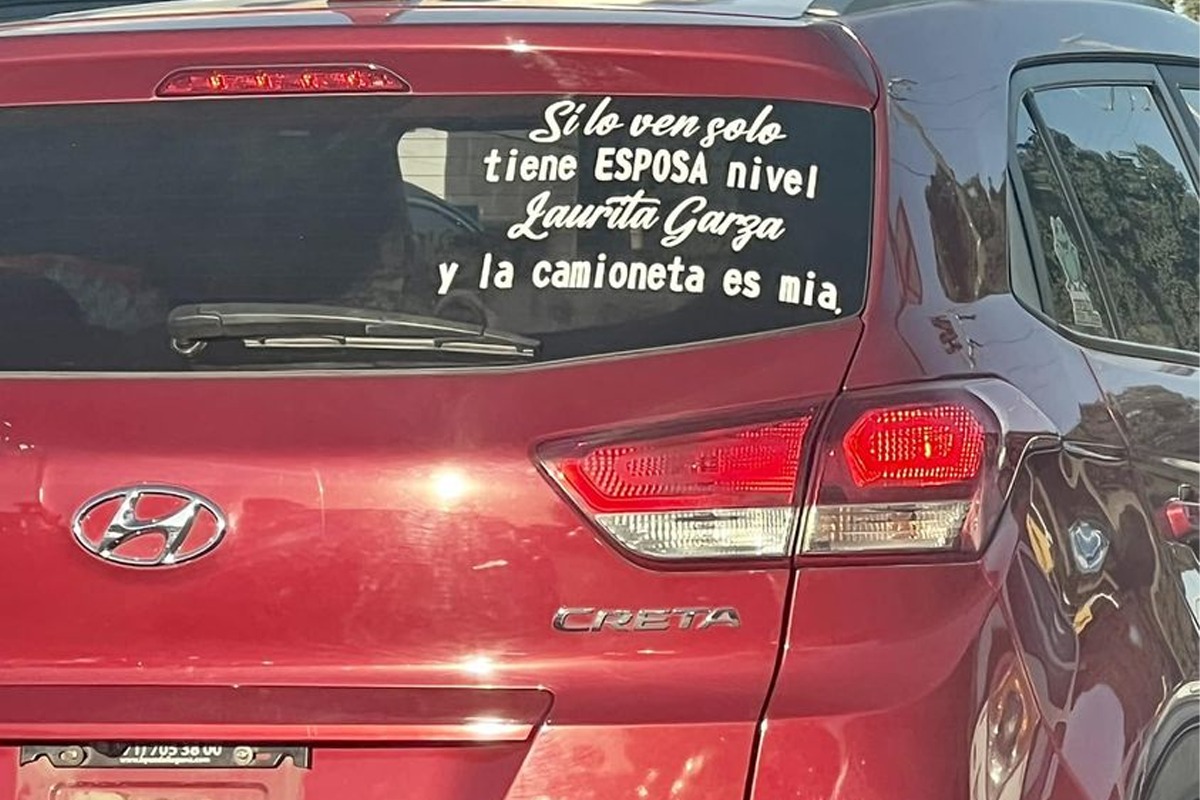 La imagen fue captada en las calles de Torreón, Coahuila (México) y ha llamado la atención de los internautas porque se trata de un recado que hace referencia al corrido de Laurita Garza, compuesto por Los Invasores de Nuevo León. “Si lo ves solo tiene esposa nivel Laurita Garza y la camioneta es mía” se lee en el vehículo a manera de apercibimiento.