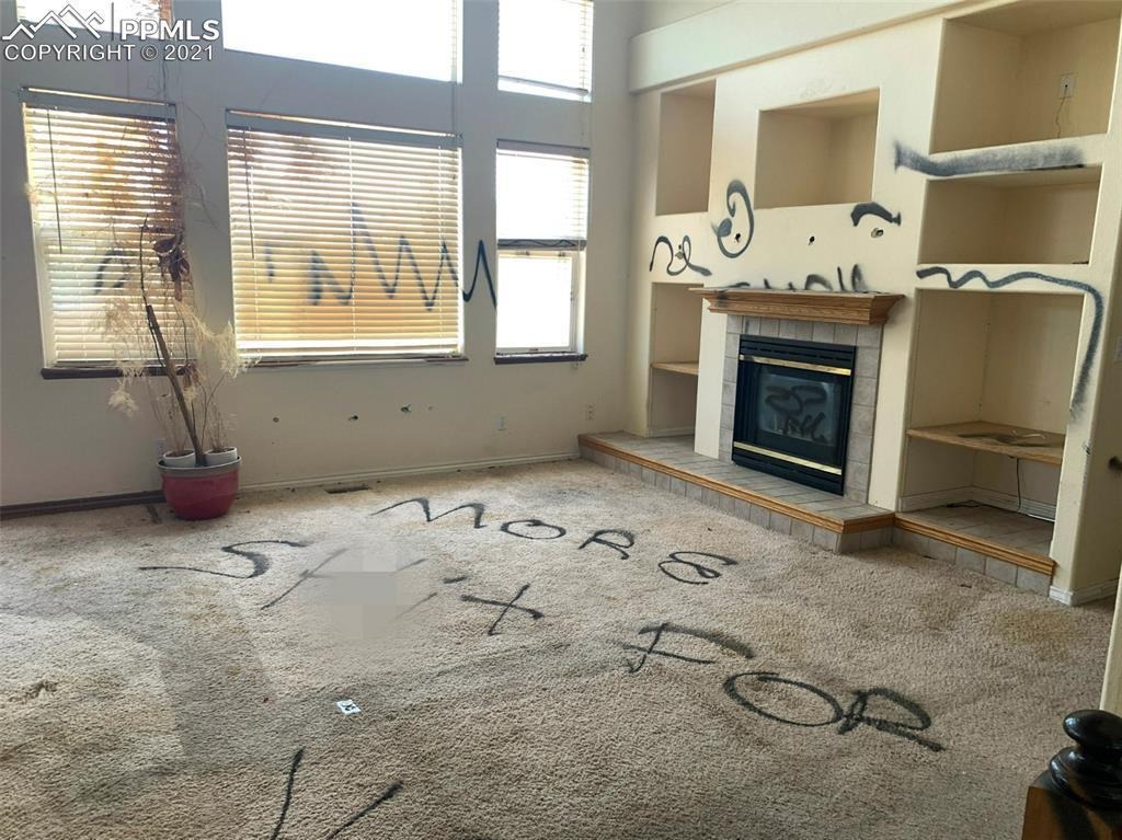 Las fotos de la publicación muestran vandalismo con vulgaridades pintadas con aerosol en paredes, pisos, puertas y gabinetes junto con agujeros de martillo en los paneles de yeso y ventanas rotas, y los vendedores no están tratando de ocultarlo.