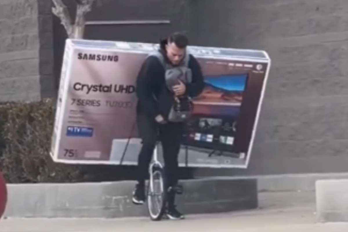 Ahorro es progreso dice un conocido refrán, por ello en lugar de gastar el dinero para un taxi, el protagonista del siguiente viral no tuvo mejor idea que trasladar por sus propios medios una pantalla gigante recién comprada, lo impresionante es que lo hizo sobre un monociclo.
