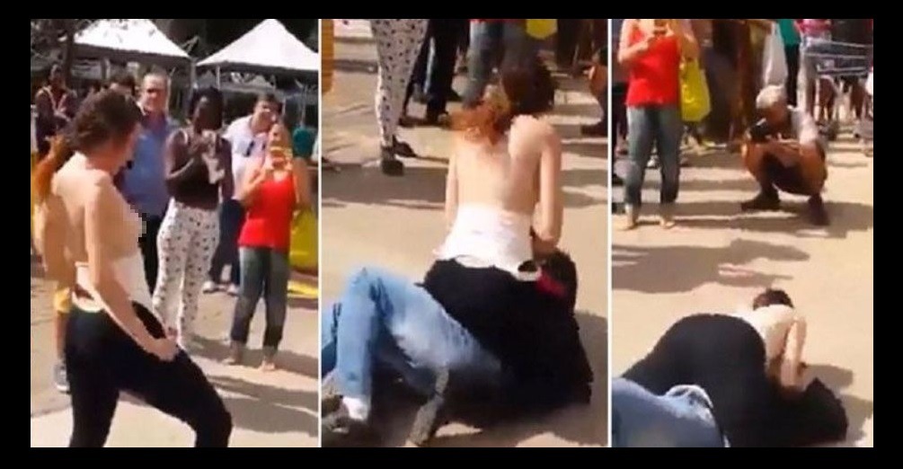 “Estoy harta de que me traten como un objeto sexual ¿Son tetas lo que quieres?”, dice la joven quien se quita el polo y empieza a golpear al hombre con su pecho. Los transeúntes se quedaron atónitos al ver la escena.