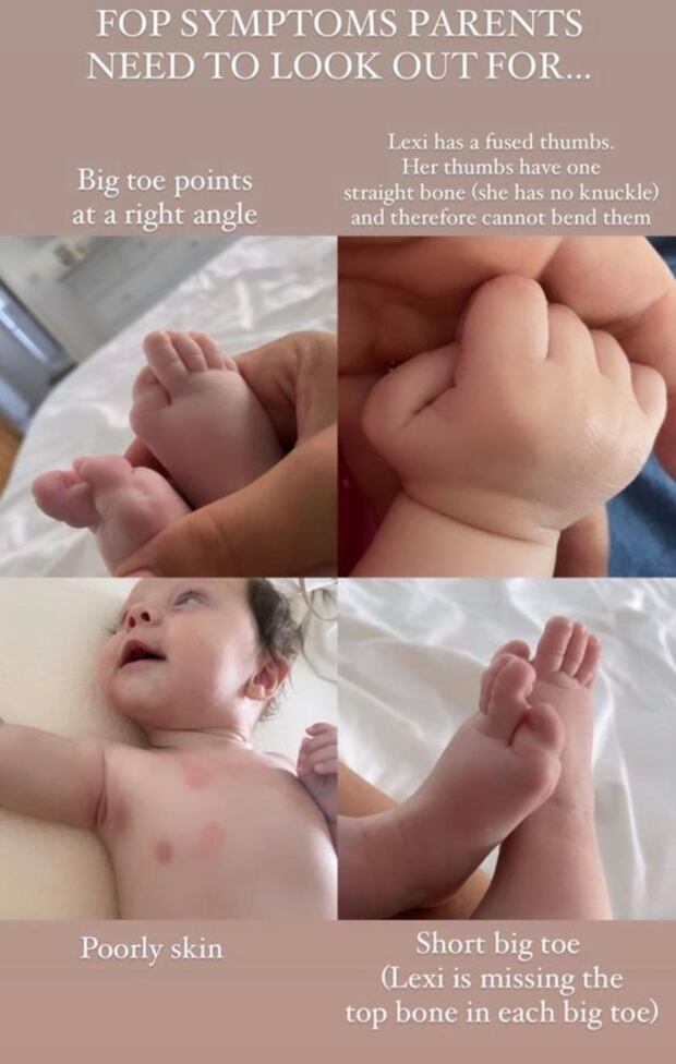 En el momento de su nacimiento, parecía una bebé normal, excepto que no movía el pulgar y tenía los dedos de los pies más grandes. Según los informes, a sus padres Alex y Dave de Hemel Hempstead les dijeron que su hija tiene una enfermedad que limita la vida llamada Fibrodisplasia Osificante Progresiva (FOP).