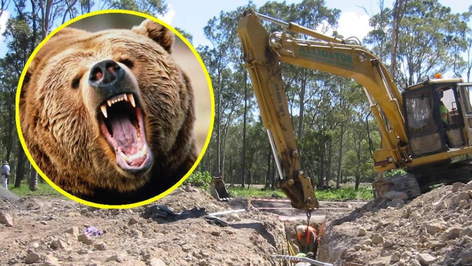 Cuando los obreros del video viral de YouTube removían grandes cantidades de tierra con una excavadora, del fondo del hoyo que hicieron emergió la cabeza de un enorme oso que soltó un fuerte alarido.