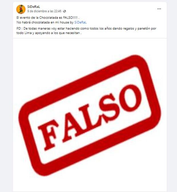 “El evento de la Chocolatada es FALSO!!!!! No habrá chocolatada en mi house by SiDeRaL PD : De todas maneras voy estar haciendo como todos los años dando regalos y panetón por todo Lima y apoyando a los que necesitan”, escribió Sideral.