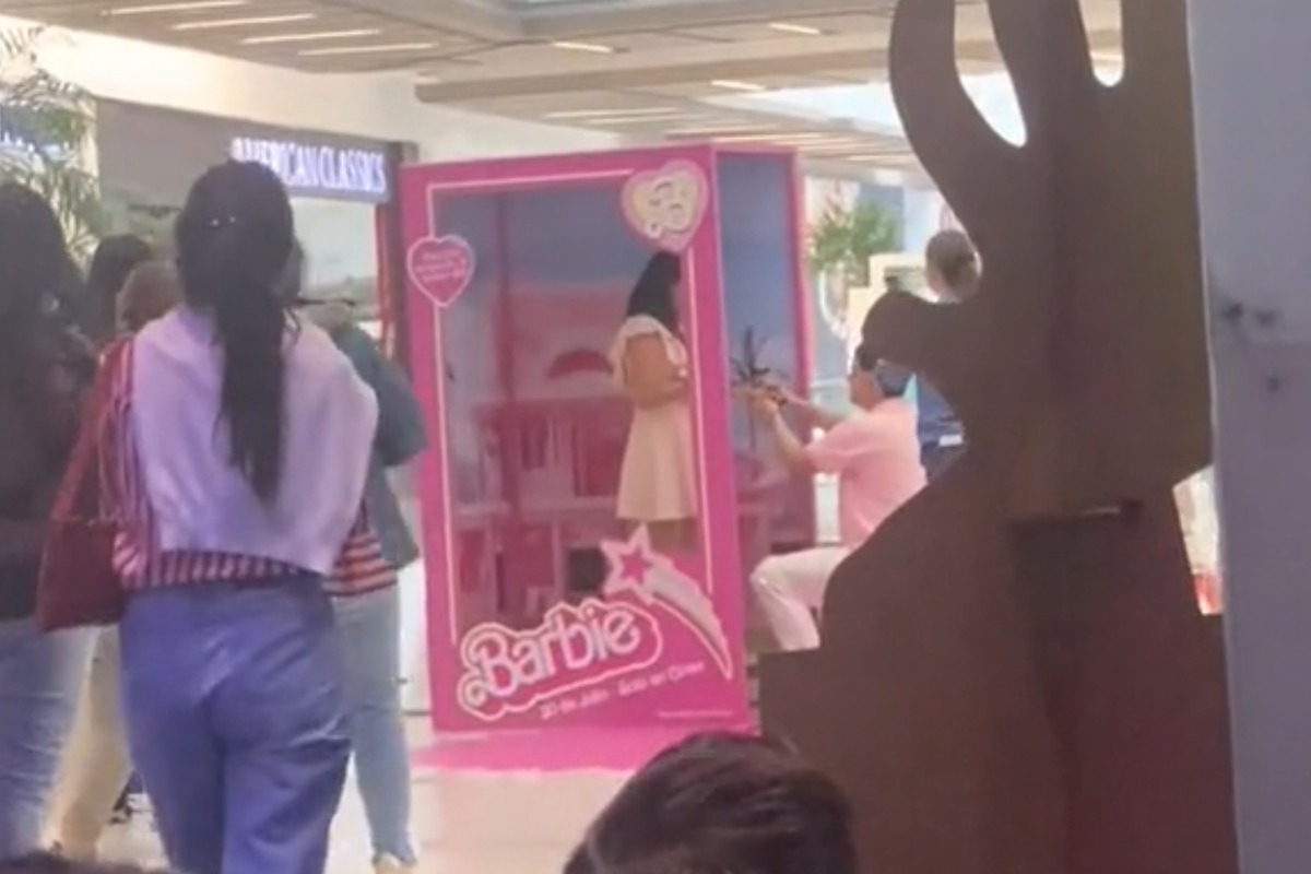 En un romántico momento de esos que sueñan tener muchas parejas de enamorados, un hombre tuvo la original idea de pedirle matrimonio a su novia segundos antes de fotografiarla en la caja de Barbie, en el marco del reciente estreno de la película en la pantalla grande.