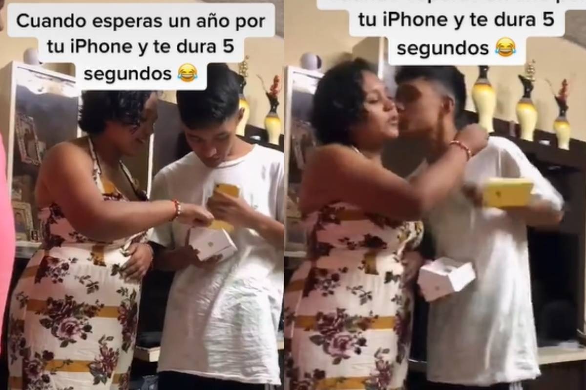 Luego de ello, el joven -que sostenía el smartphone en su mano izquierda- se acerca a dar un nuevo saludo de agradecimiento a su madre, quien levanta la mano derecha y termina tumbando el iPhone hacia el suelo.