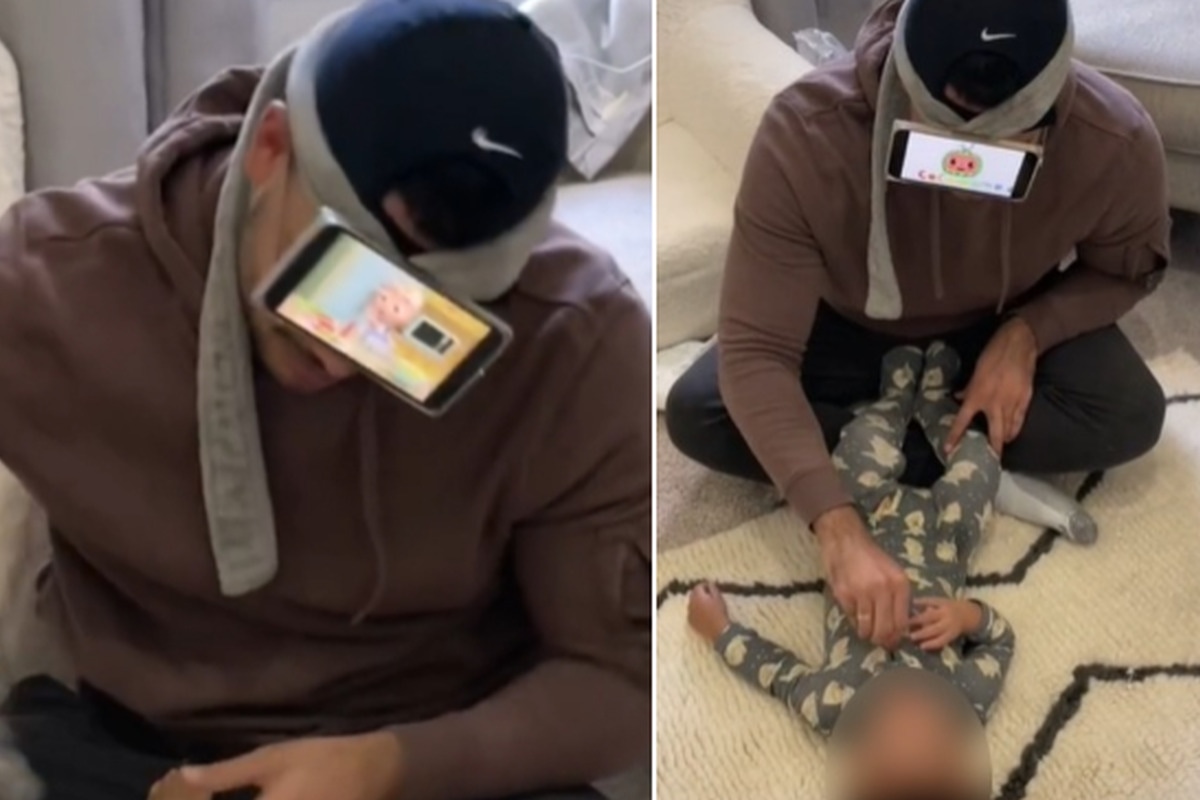 El método del progenitor realmente ha llamado la atención debido a que él apareció en el clip teniendo un celular pegado a su frente con la ayuda de un cinturón de bata. El aparato, mientras se encontraba en dicho lugar, reproducía un video que era del agrado de su pequeño.