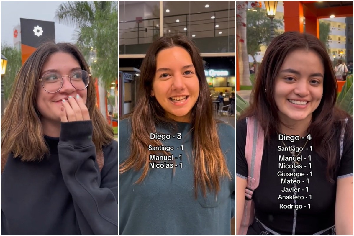 La dueña del clip empieza este contenido mostrando la pregunta que le haría a todas las personas que entrevistaría. De esta manera, este video reveló la forma en la que diferentes jóvenes recordaron los nombres de algunas exparejas para decirlas. Santiago, Manuel, Nicolas, Giuseppe, Mateo, Javier y Rodrigo fueron algunos de los mencionados.