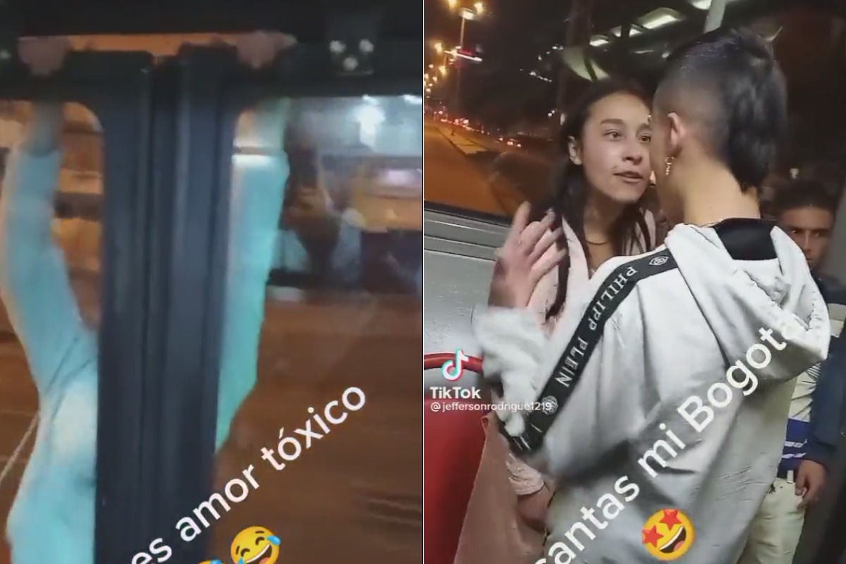 Fue a través de TikTok que se viralizaron dos videos del intenso momento. En el primero de ellos se observaba al joven colgando por afuera de la puerta cerrada de un bus en movimiento, corriendo peligro, ya que apenas iba agarrado con la yema de los dedos y las puntitas de los pies. Mientras que adentro del vehículo, su novia lo miraba llorando de preocupación.