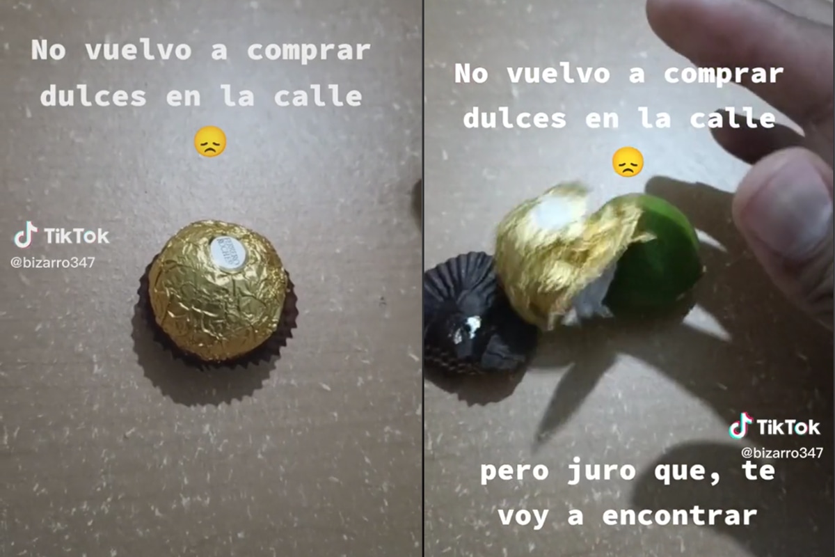 Sin embargo, con mucha pena tenemos que advertirte, que algunos vendedores chucherías suelen pasarse de listos y estafan a la gente, tal como lo ha dado a conocer un usuario en TikTok, quien asegura que compró un chocolate de la marca Ferrero Rocher, pero lo estafaron, pues encontró un limón en lugar del dulce.