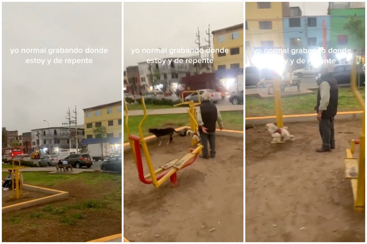 La escena empieza con este joven mostrando un poco de lo que estaba a su alrededor, pero al seguir caminando por la zona se topó con algo muy llamativo, puesto que, este muchacho presenció como un hombre estuvo empujando a su mascota en un columpio para intentar distraerla con ayuda del juego mecánico que había en el lugar.