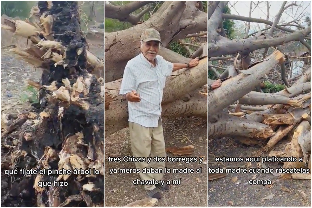 Este contenido inicia con el señor asegurando que estuvo parado conversando con un niño cuando se pronto uno de los árboles cercanos a él se desplomó y mató a muchos animales, pero lo singular del hecho fue cuando esta persona reveló que este árbol cayó muy cerca a los dos, generando que se asusten mucho por el fuerte sonido.