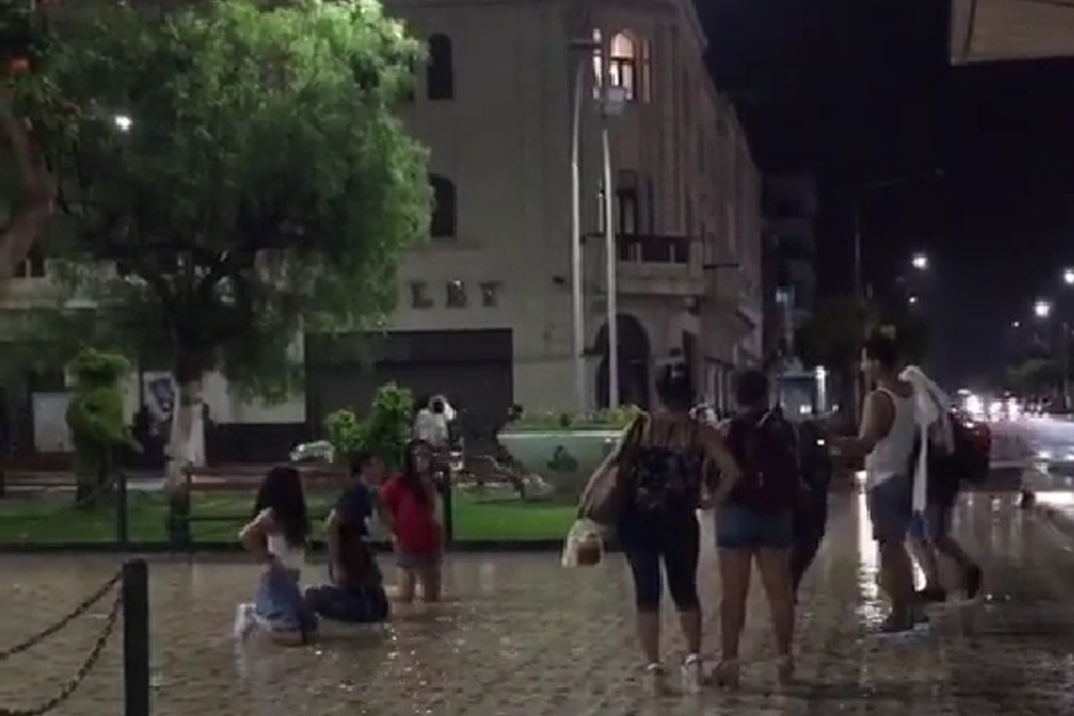 En la publicación se ve a los chicos arrodillados sobre el piso mojado del parque principal de Chiclayo y los tres bailaban sin vergüenza frente a un pequeño grupo de personas que los observaban.