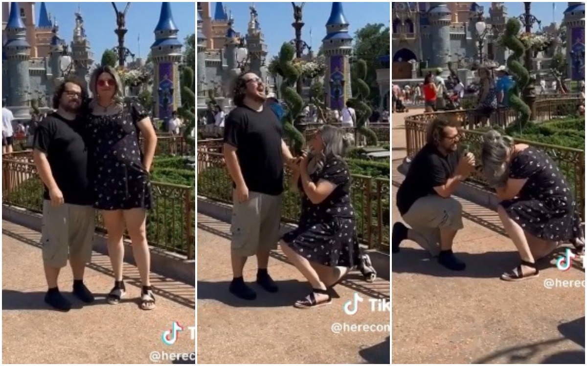 En medio del paseo por uno de los famosos parques temáticos de Disney World, en Orlando, la pareja posaba para una foto cuando ocurrió lo impensado: la mujer sacó un anillo de su bolsillo y le propuso matrimonio a su pareja.