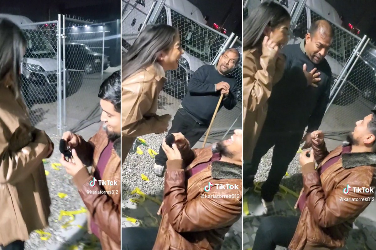 Se trata de @karlatorres82, quien compartió en su perfil de la red social china cómo su padre estaba barriendo mientras su novio se arrodilla y le pide que se case con él. La escena ha causado furor entre los usuarios, ya que tal como se puede observar en las imágenes, el padre se robó todo el protagonismo del especial momento.