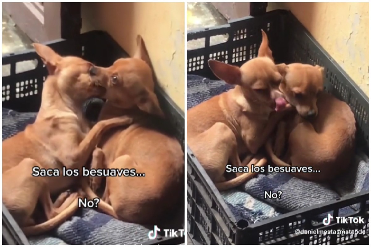 La singular escena demuestra que uno de ellos había metido todo su hocico dentro de la boca del otro para darle unos besos usando su lengua. Lo hecho por un perro parece haber dejado impactado al otro, puesto que, se le puede ver con los ojos muy abiertos y un tanto nervioso al recibir los llamativos besos por parte de su pareja.