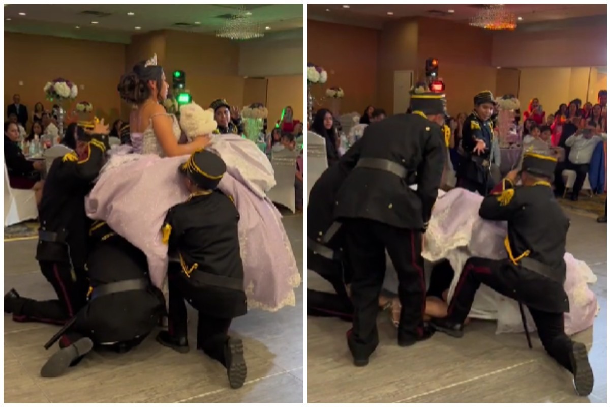 La llamativa publicación empieza con la cumpleañera alistándose para iniciar su coreografía apoyada de sus chambelanes y continúa para dejar ver la lamentable escena que vivió la joven después de no poder ser cargada en hombros por los chicos que estaban vestidos como militares. “Estos no comieron bien o les faltó un poco de chocomil”, afirma el video.