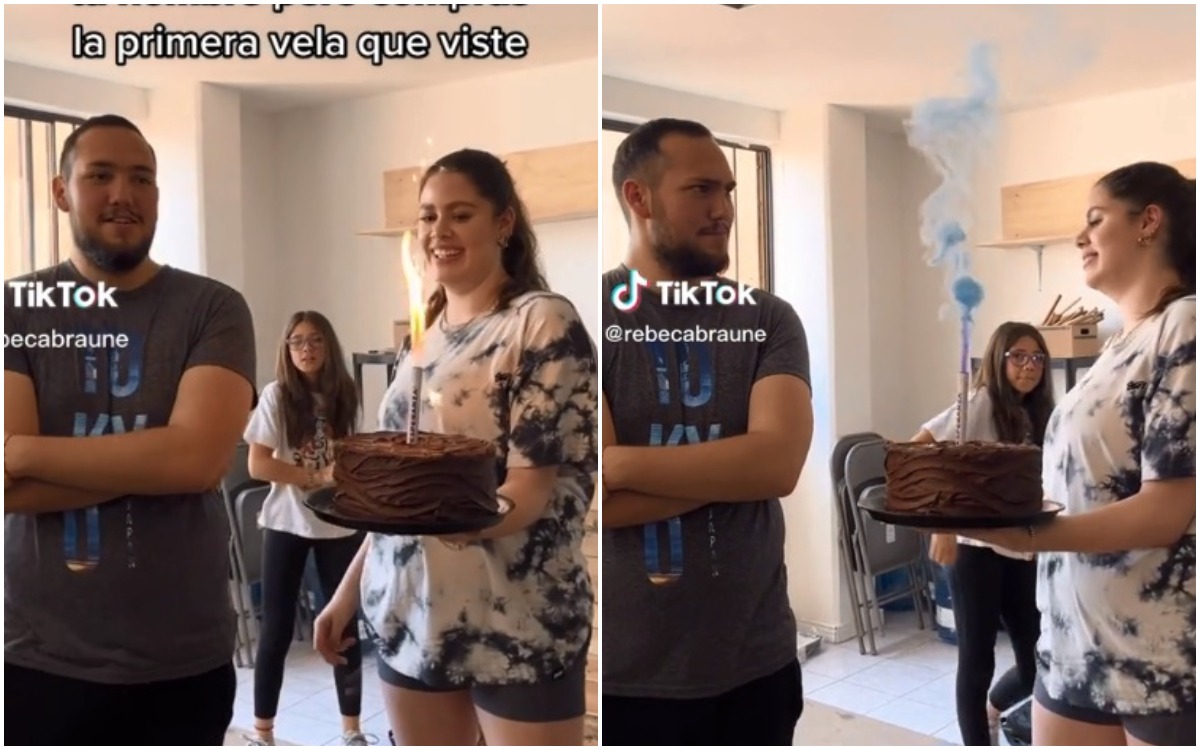 “Todo me sale mal”, escribió la usuaria Rebeca (@rebecabraune) en su cuenta de TikTok, donde compartió un video en donde se puede ver la cara de asombro del homenajeado al ver que humo celeste comenzó a salir de la bengala insertada en el pastel.