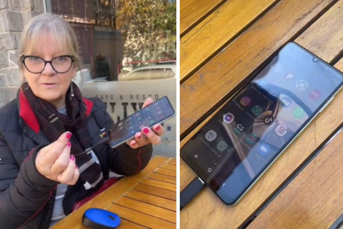 “Se me cayó el celular al agua en el lago en Bariloche. Hermoso el agua transparente, pero quedó ahí en el fondo. Lo saqué y no anda el touch. Entonces le puse un mouse inalámbrico conectando un adaptador USB al celular”, señala la inteligente mujer en un video de TikTok que fue subido por su hijo, el influencer Nico Melo.