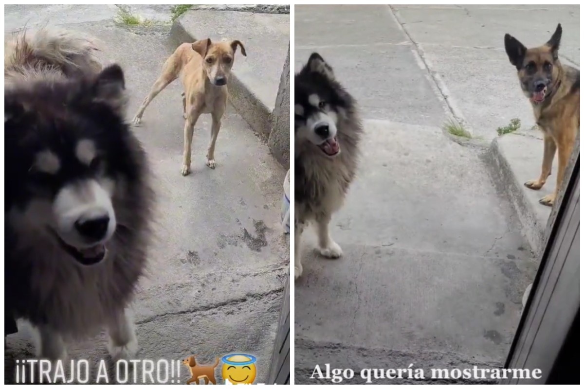 El contenido que subió esta mujer deja ver a su can esperando que ella abra la puerta para enseñarle algo, puesto que, había llegado a su hogar con una inesperada visita. El perro estaba afuera de su casa con un amigo callejero, el cual aparenta no haber comido nada durante mucho tiempo. La mujer al ver esto decide sacar un poco de alimento para dárselo sin dudar.
