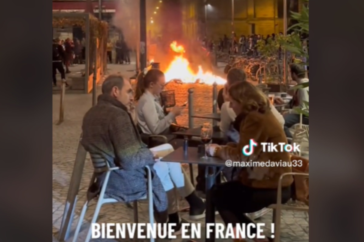 Sucede que un grupo de clientes ignoró que apenas metros más allá del establecimiento donde se encontraban practicando vida social al aire libre en la Place de la Victoire, en Burdeos, estaba ardiendo en llamas un espacio, probablemente tomado por los manifestantes.