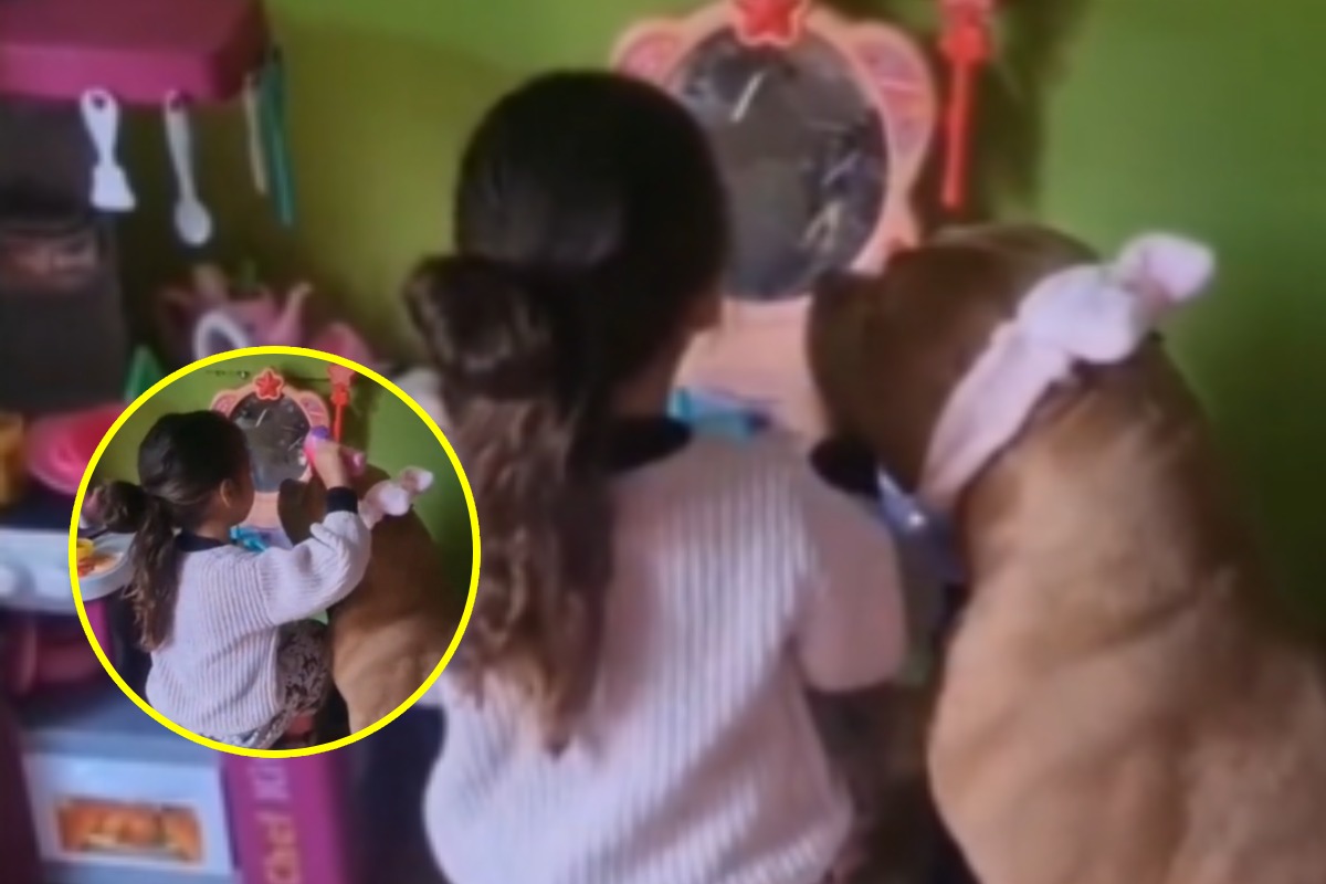 La niña y la perrita jugaban al parecer con un set de maquillaje ficticio, incluso la infante finge peinarla, y posteriormente le da un abrazo de varios segundos a lo que la mascota corresponde genuinamente.