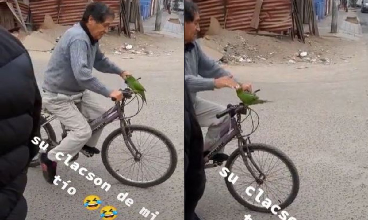 El metraje fue compartido por el usuario @cristhian_0326 donde vemos al hombre de la tercera edad transitando en su bicicleta, mientras que el ave está muy bien sujeta encima del timón de este vehículo, quien emite un sonido agudo cuando el sujeto le toca la cabeza.