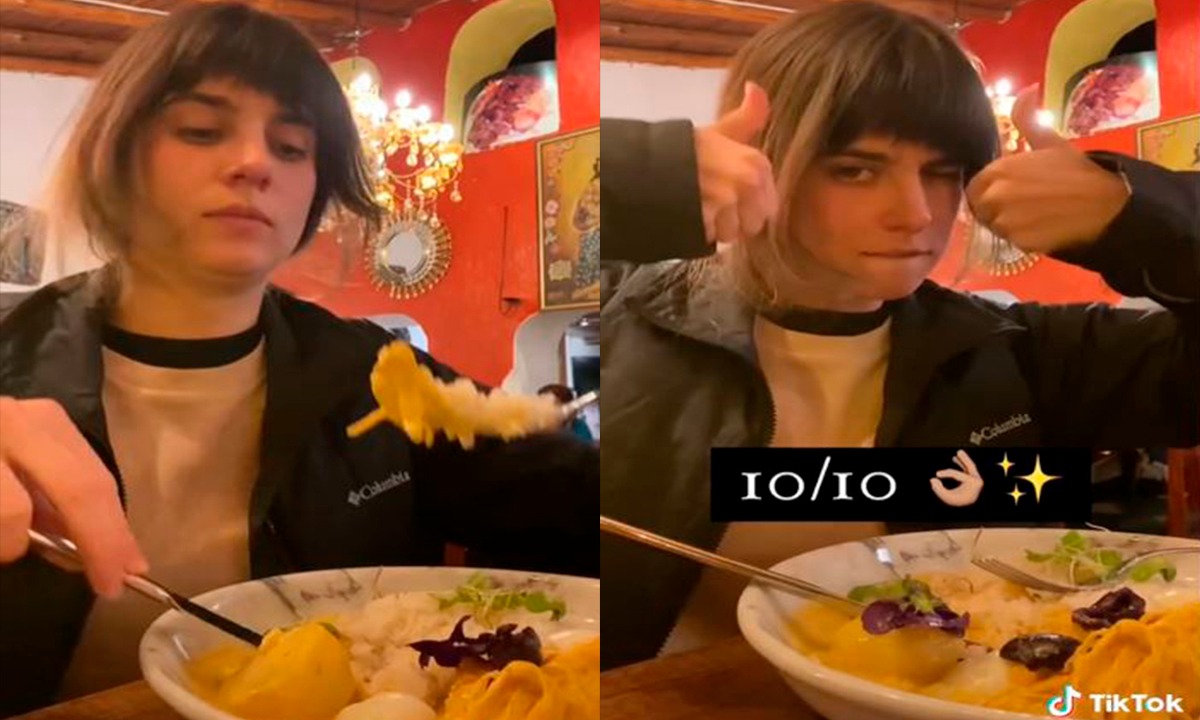 El metraje fue compartido el pasado 20 de octubre y vemos a la joven en un restaurante alistándose para engullir el platillo. Maniobra tenedor y cuchillo, junto el arroz con la mezcla para luego colocarlo en su boca: “mi reacción al probar al comer ají de gallina”.