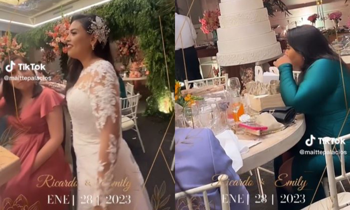 Maitté Palacios (@maittepalacios) nos comparte un video donde está al lado de la recién casada quien se da cuenta que una mujer detrás de ella, sentada sola en una mesa, está ocultando una caja de dulces.